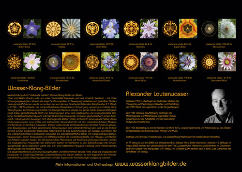 Wird ein Wassertropfen mit einer Frequenz zwischen 30 und 120 Hertz in Schwingung versetzt, können in Abhängigkeit von Temperatur, Luftdruck, chemischen Zusätzen und vielen anderen Faktoren geometrisch strukturierte, plastische Schwingungsformen entstehen. Aus der starr mechanischen Auf- und Abwärtsbewegung der Trägerplatte macht das Wasser eine rhythmisch schwingende Bewegung, die erst im Film eindrucksvoll erlebbar wird. |